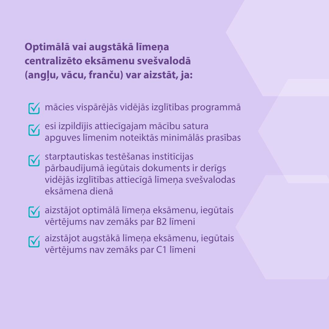 Jau iepriekš ziņots, ka svešvalodas centralizēto eksāmenu vispārējās vidējās izglītības programmā var aizstāt ar starptautiskas testēšanas institūcijas pārbaudījumu svešvalodā, ja skolēns vispārējās vidējās izglītības apguves laikā ir nokārtojis starptautiskas testēšanas institūcijas pārbaudījumu un ir izpildījis attiecīgajam mācību satura apguves līmenim noteiktās minimālās prasības iegūtajam vērtējumam. Pārbaudījumā iegūtais vērtējums nedrīkst būt zemāks par B2 līmeni, aizstājot optimālā mācību satura apguves līmeņa eksāmenu, un C1 līmeni, aizstājot augstākā mācību satura apguves līmeņa eksāmenu, kā arī starptautiskās testēšanas institūcijas izsniegtajam dokumentam jābūt derīgam paredzētajā vidējās izglītības attiecīgā līmeņa svešvalodu eksāmena dienā.