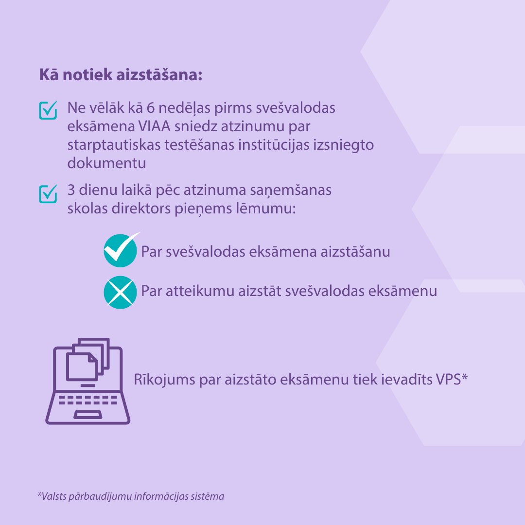 Skolēnam, kurš vēlas aizstāt svešvalodas eksāmenu ar starptautiskas testēšanas institūcijas pārbaudījumu, no attiecīgā mācību gada 1. februāra līdz ne vēlāk kā astoņām nedēļām pirms svešvalodas eksāmena norises jāiesniedz izglītības iestādes vadītājam iesniegums ar lūgumu aizstāt svešvalodas eksāmenu ar institūcijas pārbaudījumu un iegūtā dokumenta kopija, uzrādot tā oriģinālu. VIAA ne vēlāk kā sešas nedēļas pirms eksāmena norises sniegs atzinumu par starptautiskas testēšanas institūcijas izsniegto dokumentu, un izglītības iestādes vadītājs triju darbdienu laikā pēc atzinuma saņemšanas pieņems lēmumu par svešvalodas eksāmena aizstāšanu ar institūcijas pārbaudījumu vai par atteikumu aizstāt svešvalodas eksāmenu ar institūcijas pārbaudījumu.