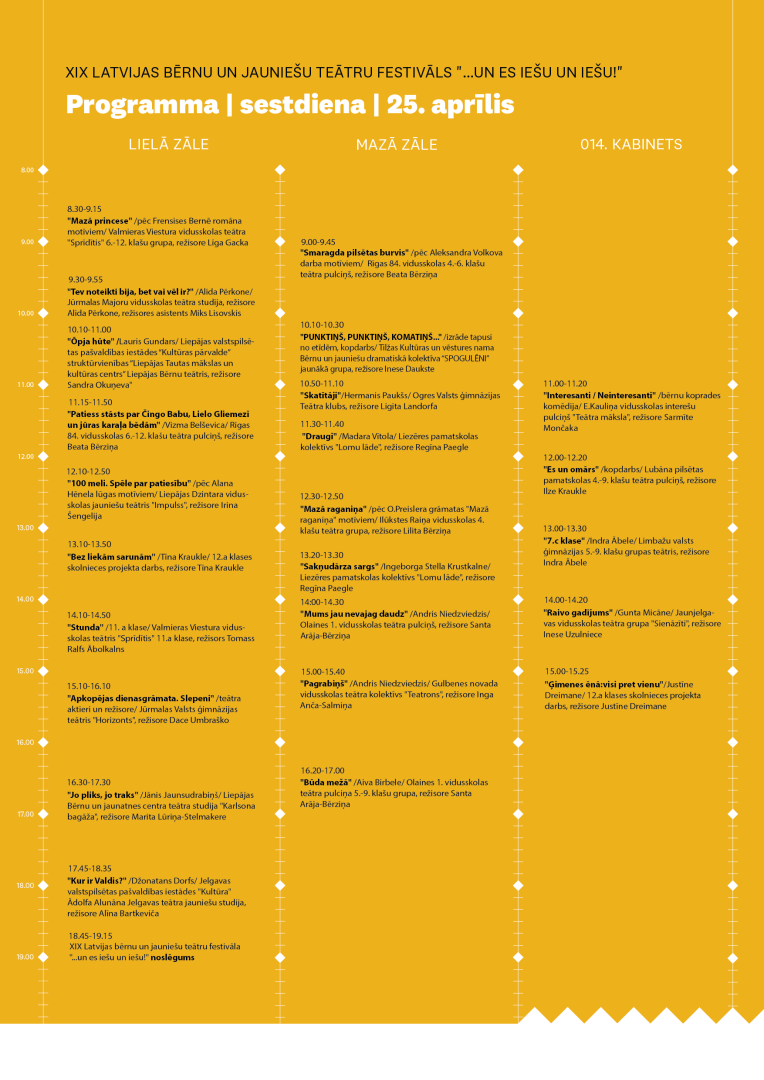 Divu dienu laikā skatītājiem būs iespēja noskatīties vairāk nekā 50 izrādes, kurās piedalīsies bērnu un jauniešu teātru kolektīvi no Latvijas. Izrāžu piedāvājums būs daudzveidīgs – no klasisko darbu interpretācijām līdz mūsdienīgiem un eksperimentāliem skatuves risinājumiem.