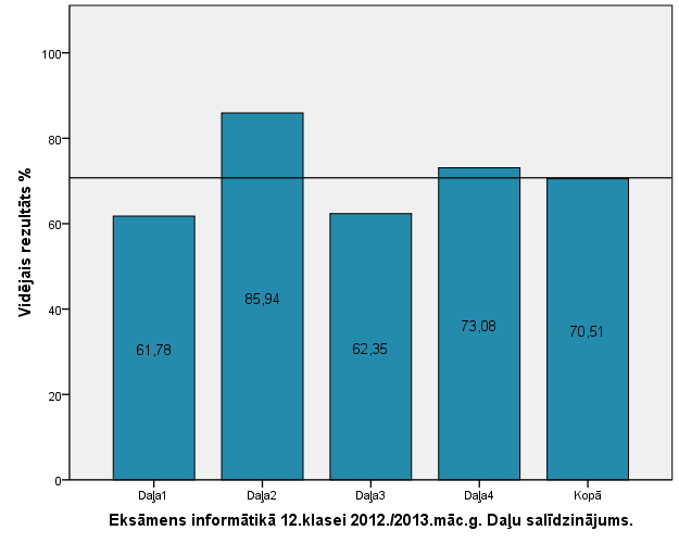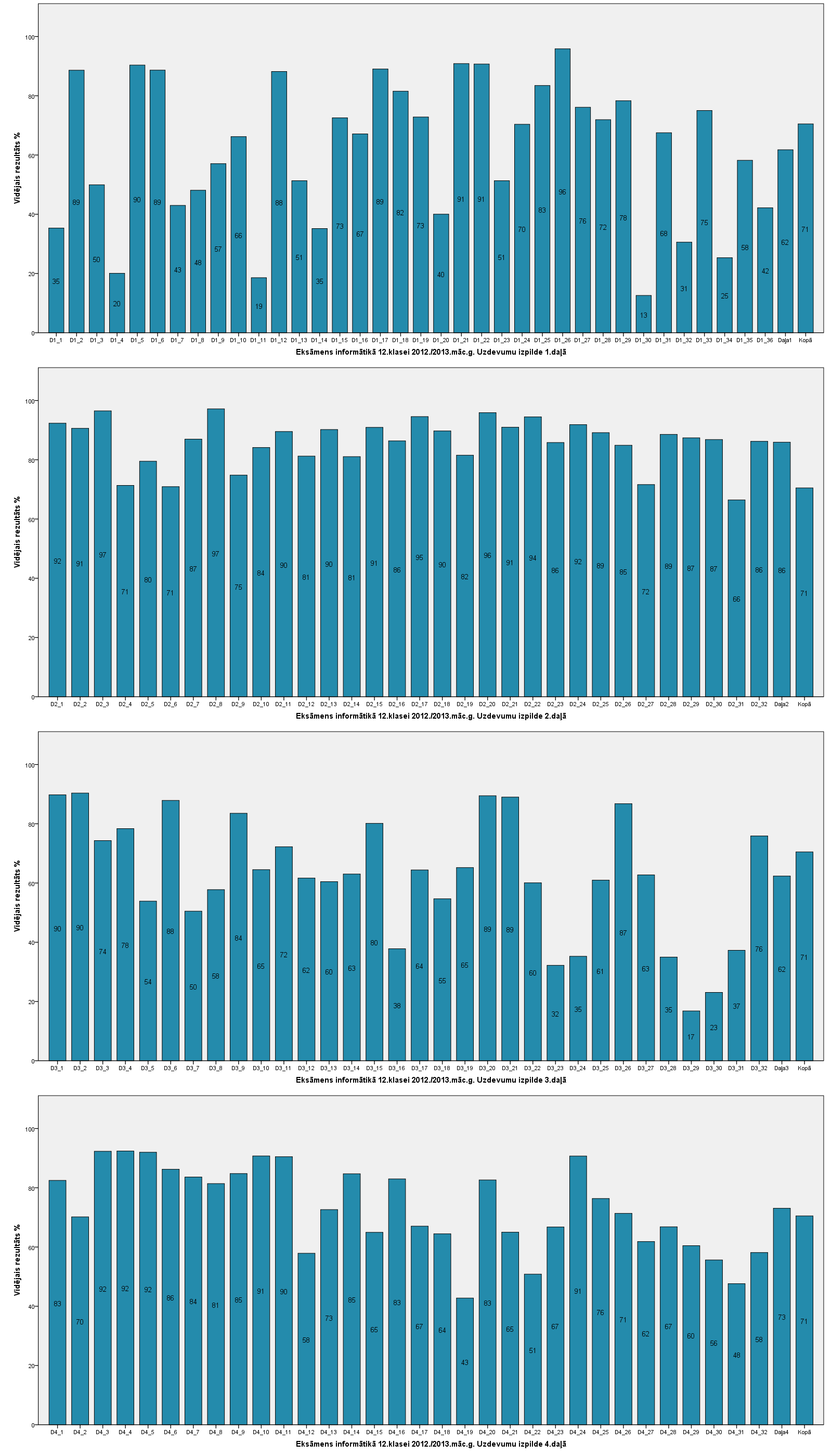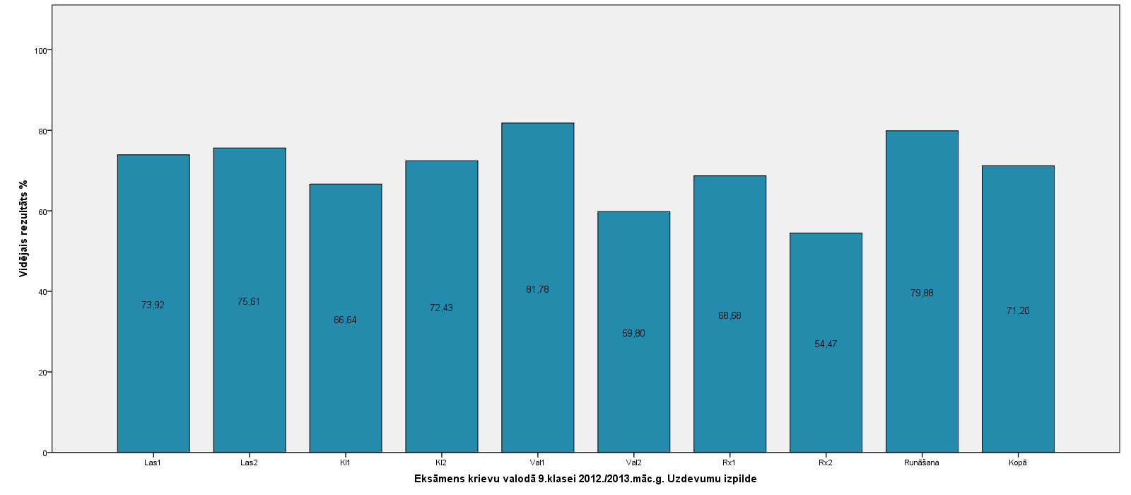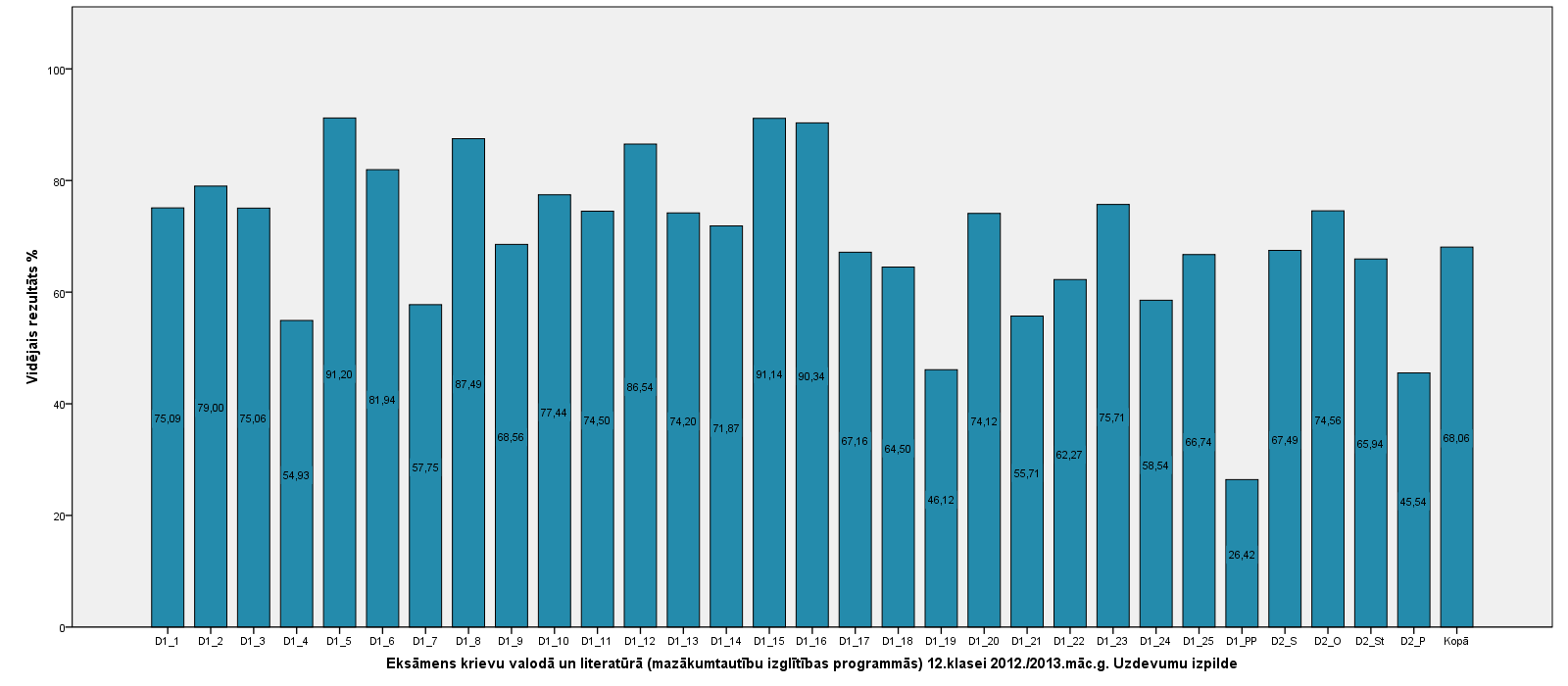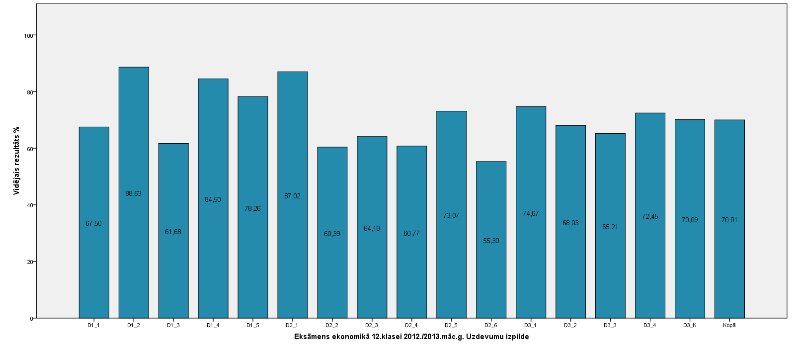Vidējo sasniegumu analīzē tiek izmantoti katra skolēna iegūtais vērtējums pret maksimāli iespējamo attiecīgajā eksāmenā. Šie dati tiek izteikti % jeb kopprocentos. Uz sertifikāta tas tiek atspoguļots kā kopvērtējums. Piemēram, ja matemātikas 12.klases eksāmenā maksimālie punkti bija 80 un skolēns ieguva 65 punktus, tad kopprocents ir 81%. No šīm vērtībām arī tiek aprēķināts skolas vidējais un valsts vidējais vērtējums.