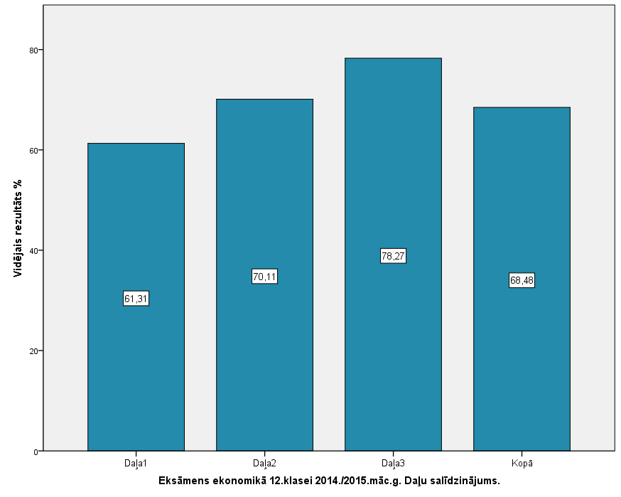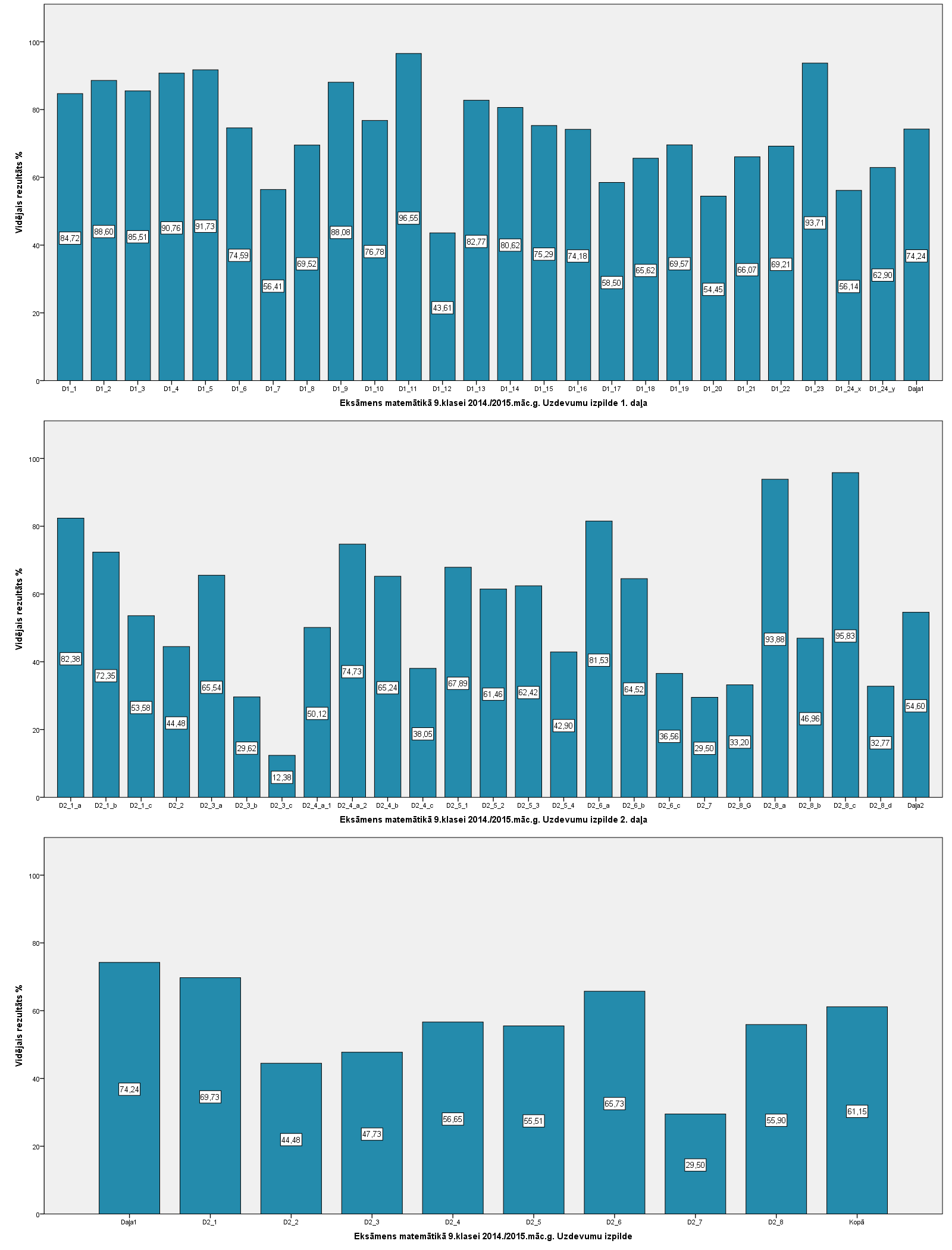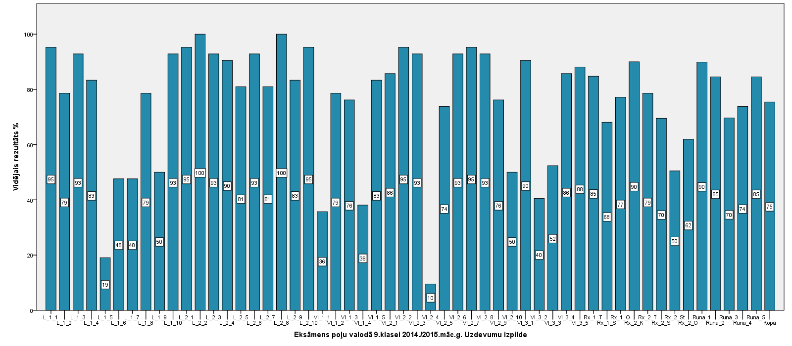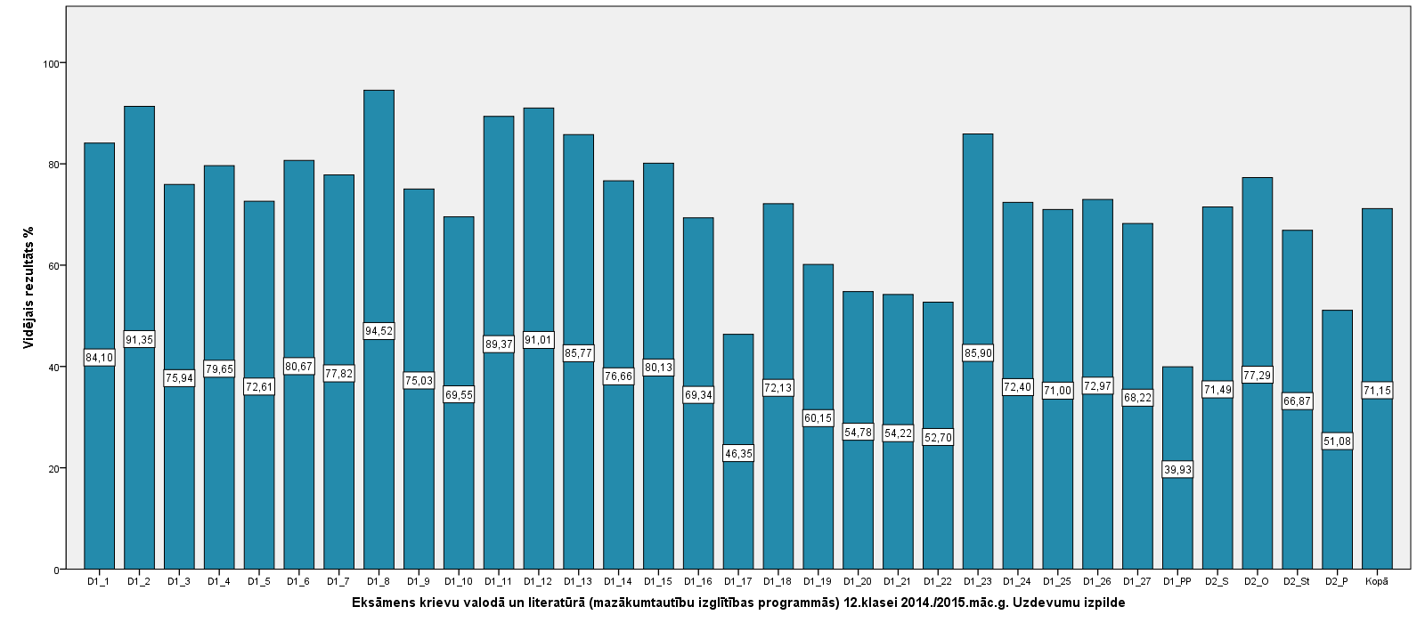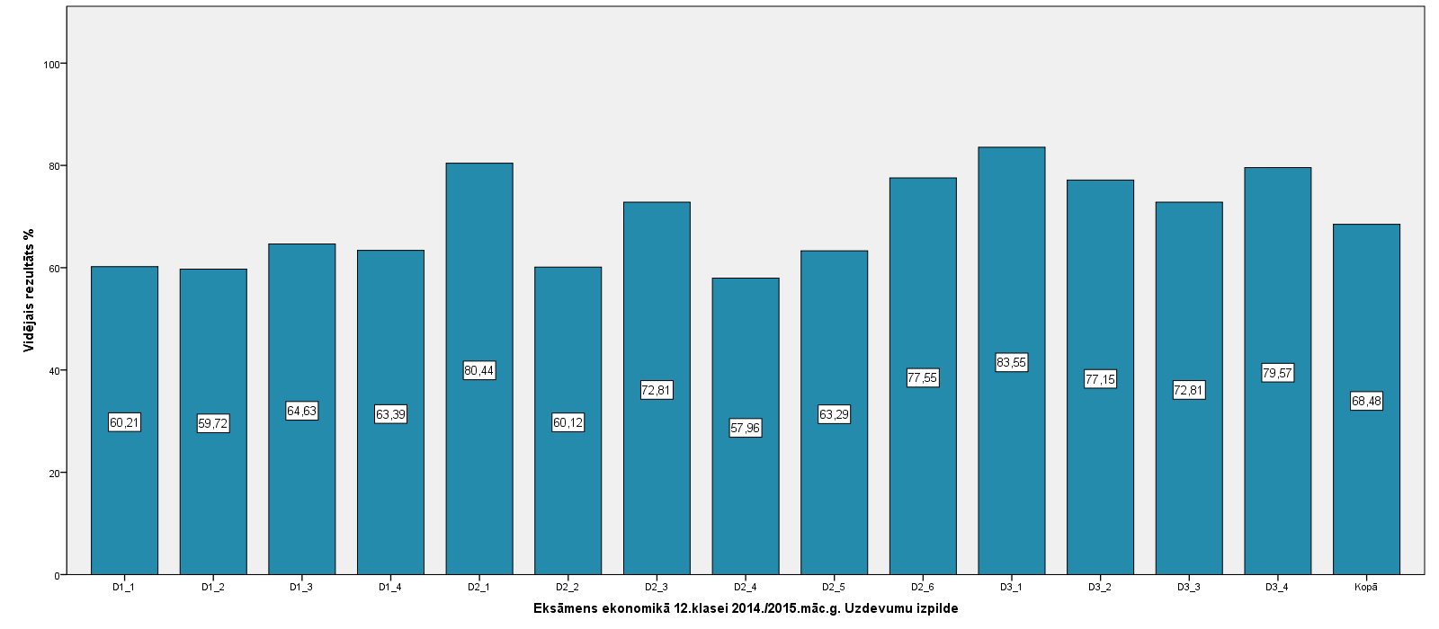 Vidējo sasniegumu analīzē tiek izmantoti katra skolēna iegūtais vērtējums pret maksimāli iespējamo attiecīgajā eksāmenā. Šie dati tiek izteikti % jeb kopprocentos. Uz sertifikāta tas tiek atspoguļots kā kopvērtējums. Piemēram, ja matemātikas 12.klases eksāmenā maksimālie punkti bija 80 un skolēns ieguva 65 punktus, tad kopprocents ir 81%. No šīm vērtībām arī tiek aprēķināts skolas vidējais un valsts vidējais vērtējums.