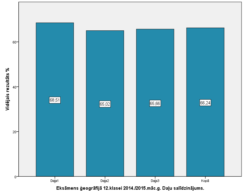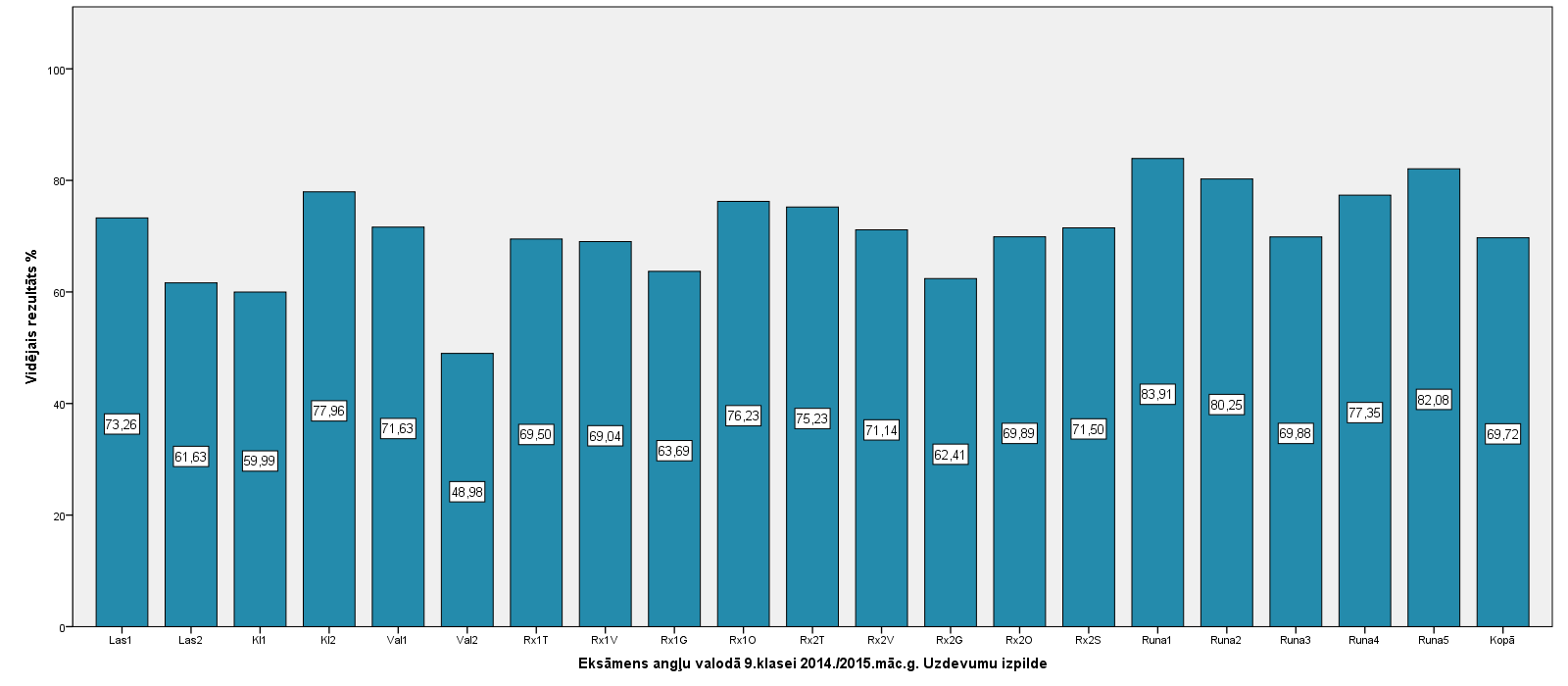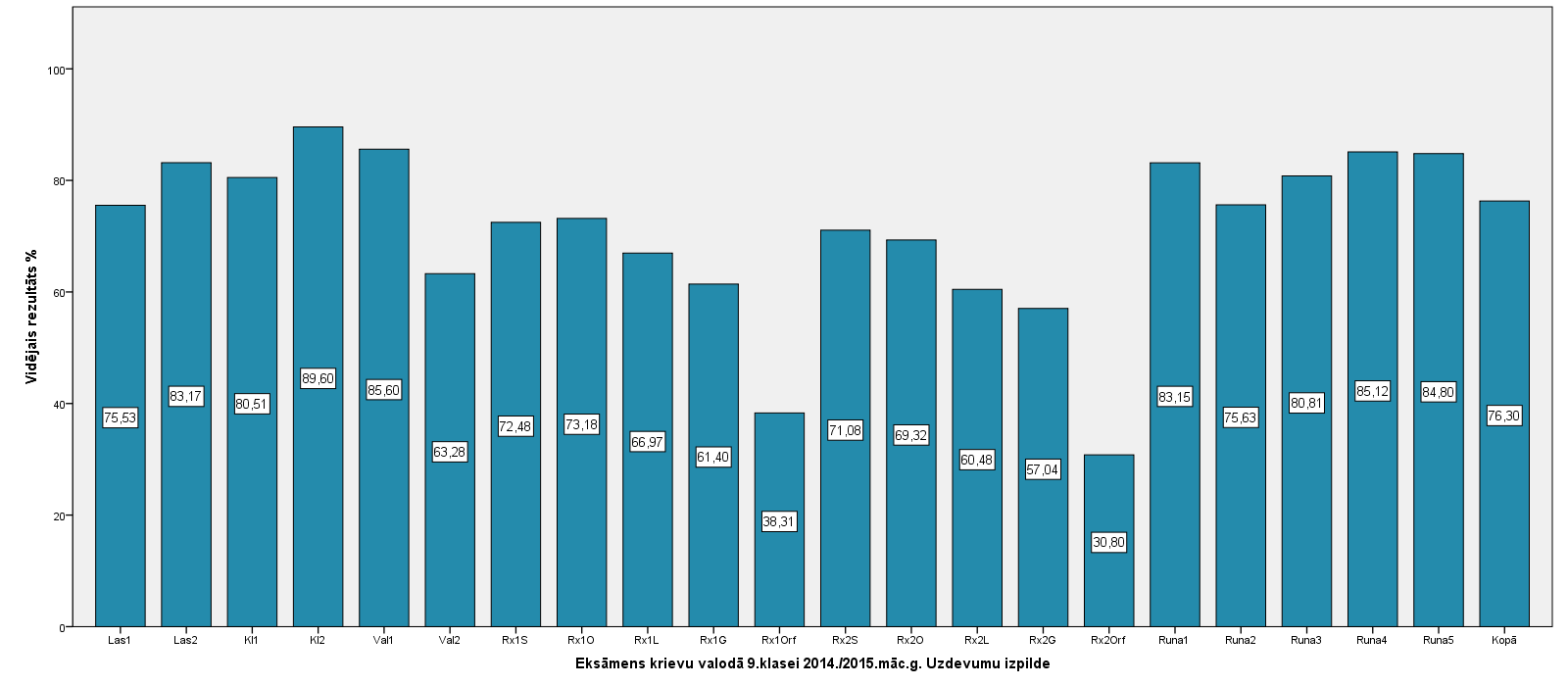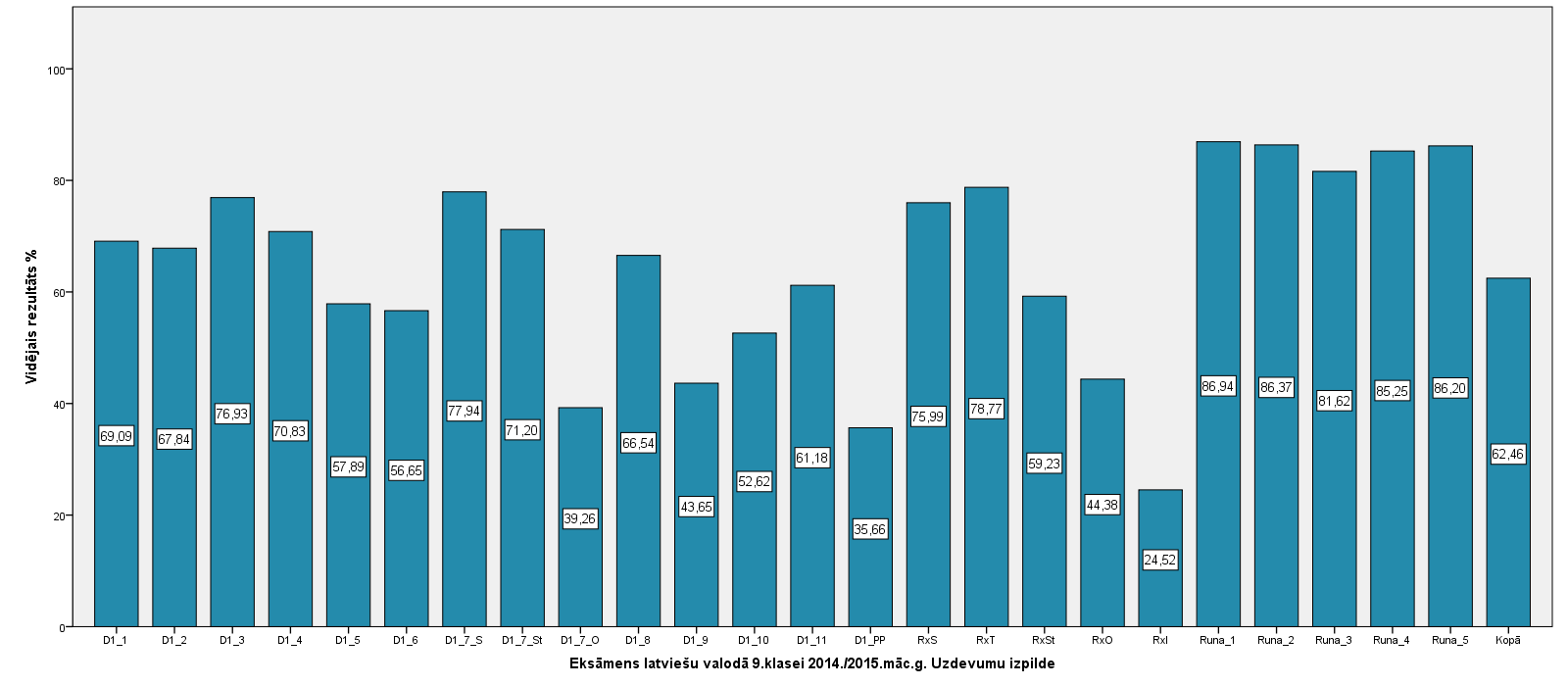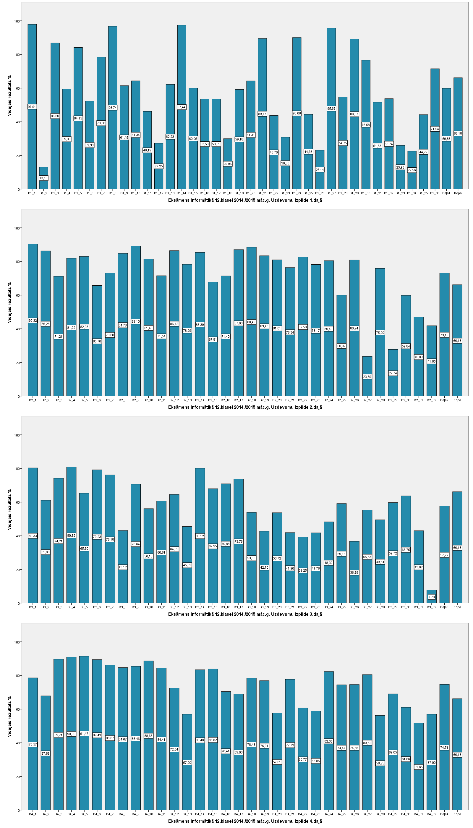 Vidējo sasniegumu analīzē tiek izmantoti katra skolēna iegūtais vērtējums pret maksimāli iespējamo attiecīgajā eksāmenā. Šie dati tiek izteikti % jeb kopprocentos. Uz sertifikāta tas tiek atspoguļots kā kopvērtējums. Piemēram, ja matemātikas 12.klases eksāmenā maksimālie punkti bija 80 un skolēns ieguva 65 punktus, tad kopprocents ir 81%. No šīm vērtībām arī tiek aprēķināts skolas vidējais un valsts vidējais vērtējums.