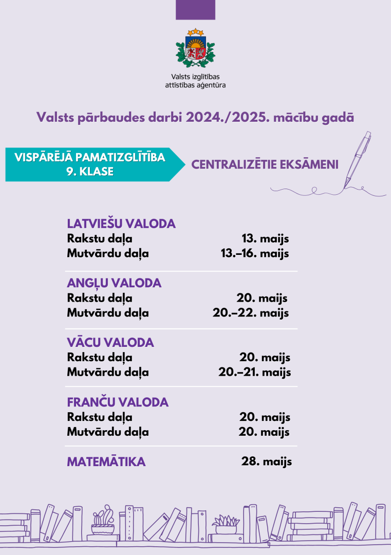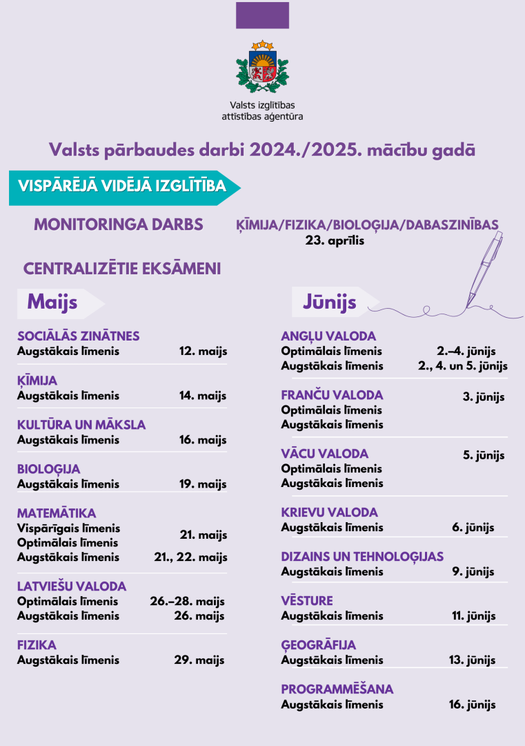 Valsts pārbaudes darbu norises laiki 2024./2025. mācību gadā.